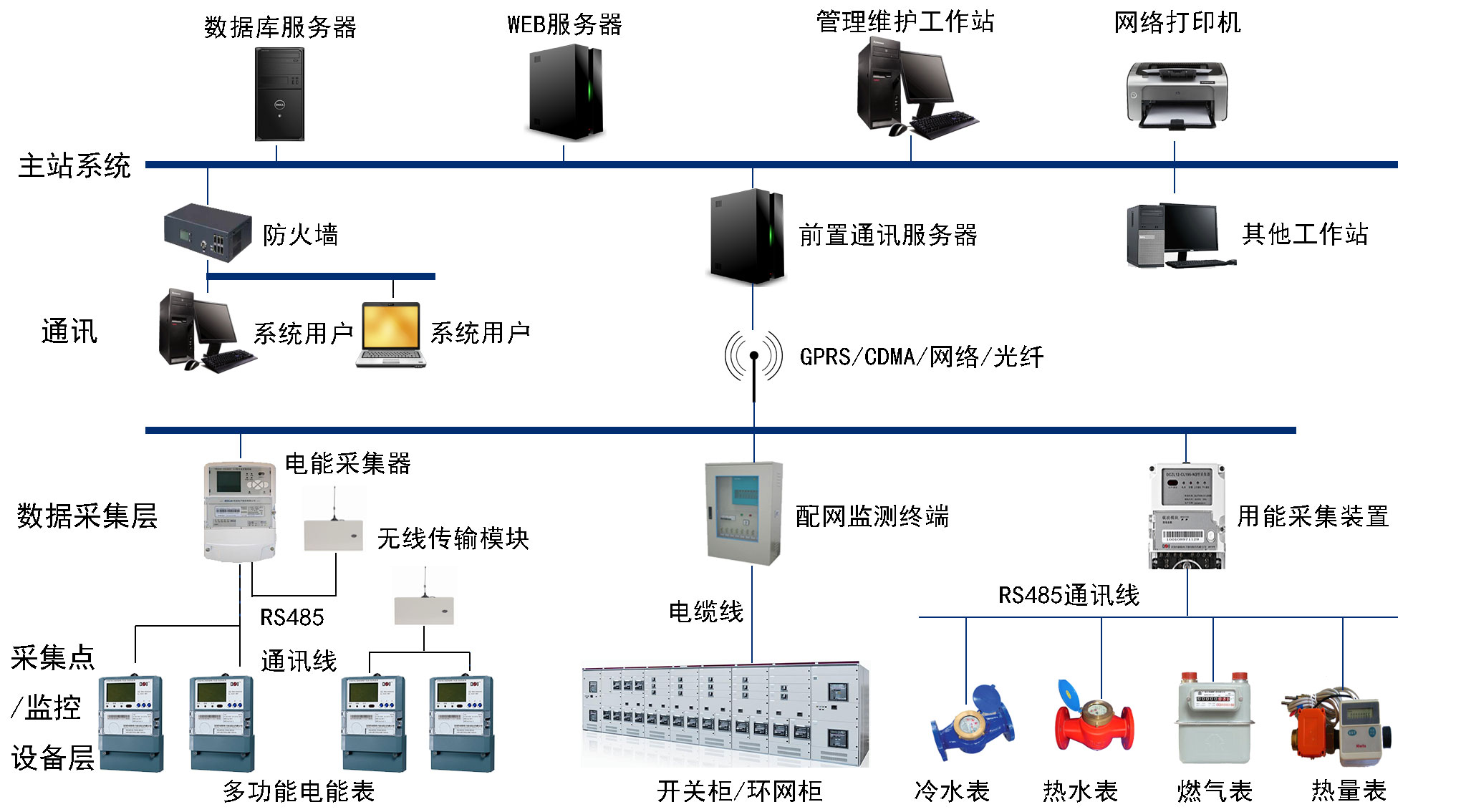 通讯设备将各采集设备的数据通过数据采集终端发送至后台实时数据管理模块。通讯模式可有:RS485、RS232、以太网、载波、光纤、GPRS等。